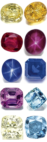 Emeralds, Rubies, Sapphires (click for Sapphire information), Tanzanites, Aquamarines.